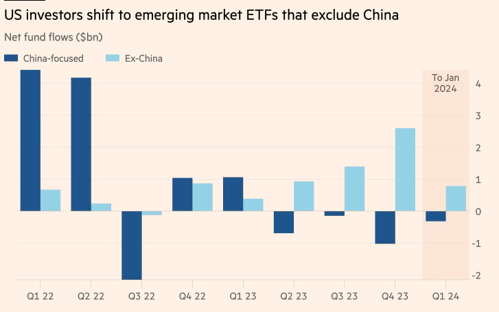 Negli Stati Uniti, gli investitori nei mercati emergenti stanno riducendo l'esposizione alla Cina e puntano invece su fondi negoziati in borsa che escludono il gigante asiatico. Una recente analisi condotta da ETF.com per il Financial Times ha rivelato che l'afflusso netto di capitali in otto ETF statunitensi sui mercati emergenti, escludendo la Cina, è più che triplicato, raggiungendo i 5,3 miliardi di dollari l'anno scorso. Questo contrasta con un deflusso di 802 milioni di dollari da 55 ETF focalizzati sulla Cina nel 2023, rispetto agli afflussi di 7,5 miliardi di dollari l'anno precedente.