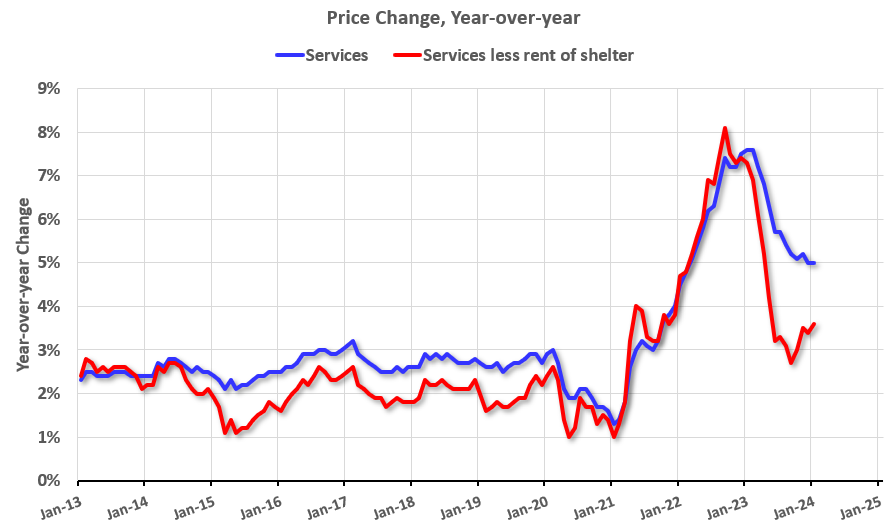 Ma torniamo ad occuparci del mercato azionario USA, che nella giornata di martedì scorso ha fatto registrare una discreta correzione, con tanto di apertura in gap down per il Nasdaq100 e l’S&P500, dopo la pubblicazione del dato sull’inflazione CPI di gennaio che ha sorpreso tutti per l’entità del dato, +0,4% il ‘core’ mensile con un + 0,1% su dicembre 2023 e +3,9% il ‘core’ annuale stesso dato di dicembre, quando gli economisti si aspettavano un calo dello 0,2%. La forza dei numeri riflette principalmente aumenti di inizio anno per le categorie come medical services (+0.7%), car insurance (+1.4%), car repair (+0.8%), personal care services (+0.7%). La categoria servizi, depurata dalla componente alloggi, sta continuando a dare segnali di ripresa (+0.85% sul mese) (v. grafico):