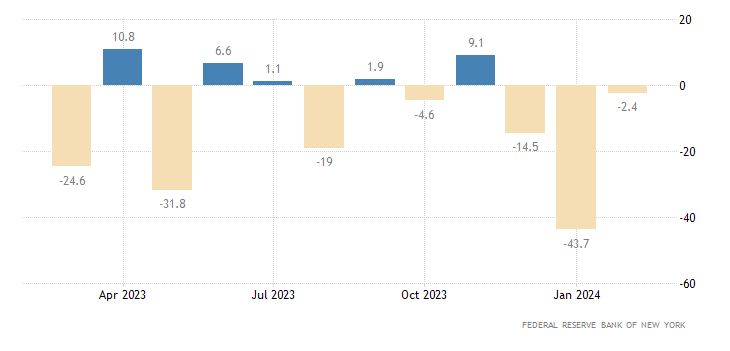 L’indice manifatturiero del New York Empire State per il terzo mese consecutivo presenta il segno ‘meno’. A febbraio è pari a -2,40, in crescita rispetto ai -43,70 punti di gennaio. Il dato è rilasciato dalla Federal Reserve Bank di New York.