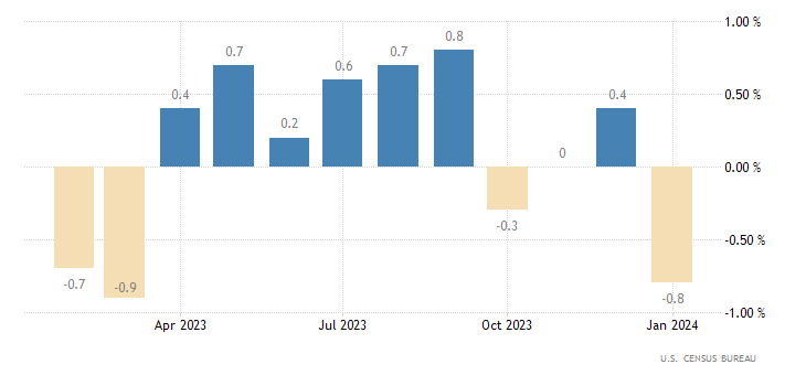 Le vendite al dettaglio, a livello mensile, hanno deluso come non facevano da tempo. Si tratta del report più debole da marzo 2023. A gennaio si rivede il segno ‘meno’, che registra un -0,8%, rispetto ad un consensus del -0,1% ed un +0,4% di dicembre (rivisto da +0,6%). Il dato è rilasciato dall’U.S. Census Bureau.
