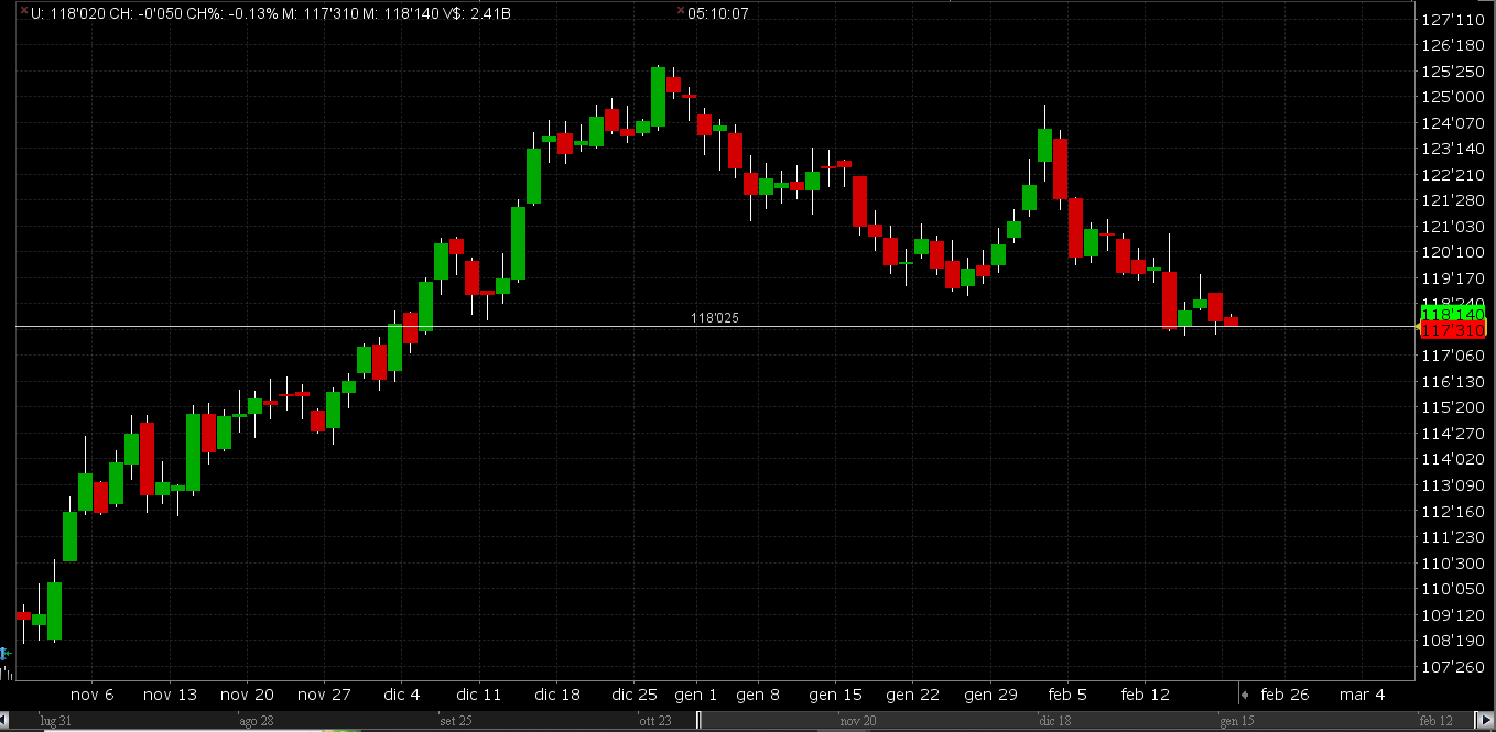 Il T-Bond invece rimane ad oggi ancora aggrappato ai 118 punti che sono la barriera oltre la quale non andare nel movimento di breve per quanto riguarda i Titoli di Stato statunitensi.