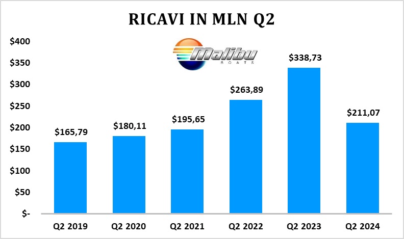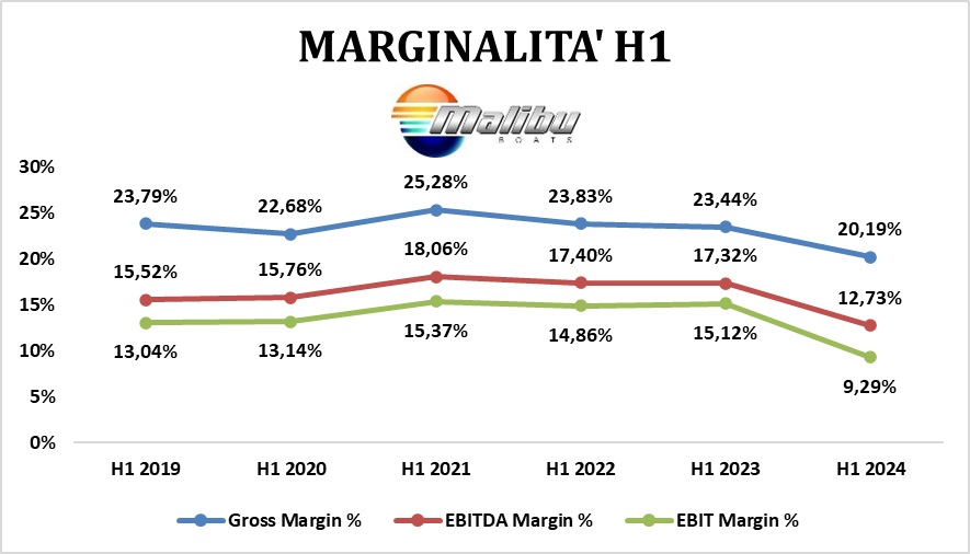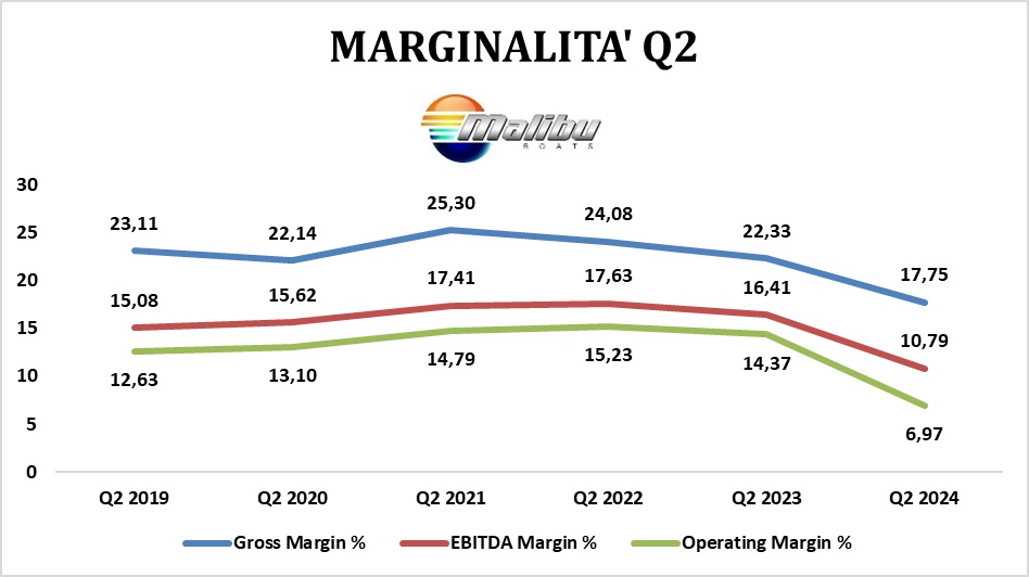 Per effetto di quanto illustrato in termini di fatturato, la marginalità di MALIBU BOATS ha inevitabilmente registrato una corrispondente diminuzione. Nel secondo trimestre, ad esempio, l'EBITDA MARGIN % passa dal 22,33% al 17,75%.