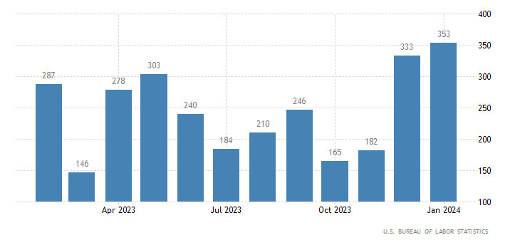 Il labour market report pubblicato non ha nulla a che vedere con quanto era ipotizzabile sulla base delle evidenze. La creazione di posti di lavoro, comprese le revisioni dei 2 mesi precedenti, è da sballo. Nel settore non-agricolo a gennaio sono stati creati 353 mila posti di lavoro, ben oltre il consensus di 180 mila ed in crescita rispetto al dato di 333 mila di dicembre (rivisto da 216 mila).
