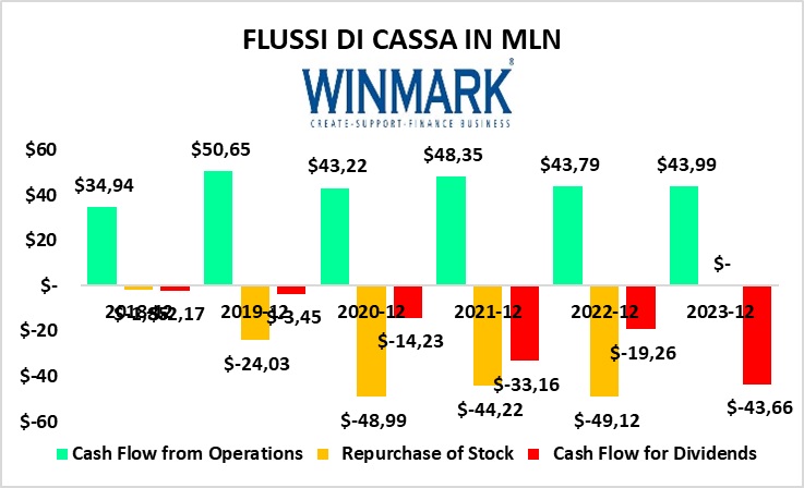 Come diretta conseguenza dell'elevata marginalità, in assenza di particolari investimenti, WINMARK si trova a generare un elevatissimo livello di liquidità. Nell'ultimo anno, il management ha sospeso l'aggressivo piano di buyback attivo negli anni precedenti. La parte rilevante della liquidità in eccesso è stata corrisposta agli azionisti per ben $ 43,66 mln attraverso il pagamento dei dividendi.