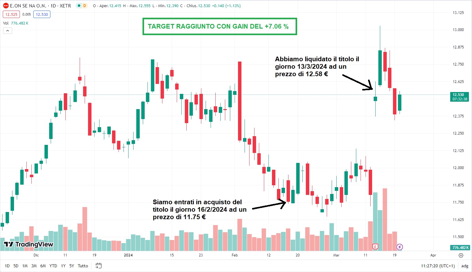 Abbiamo acquisto il titolo tedesco precisamente il giorno 16 febbraio 2024, al prezzo di 11,75 € con la strategia Azioni Internazionali del Portafoglio Storico. Dopo meno di un mese, festività incluse, e precisamente il giorno 13 marzo 2024, il titolo è riuscito a toccare il nostro livello di target a 12,58 € al quale abbiamo venduto guadagnando un buon + 7,06% !