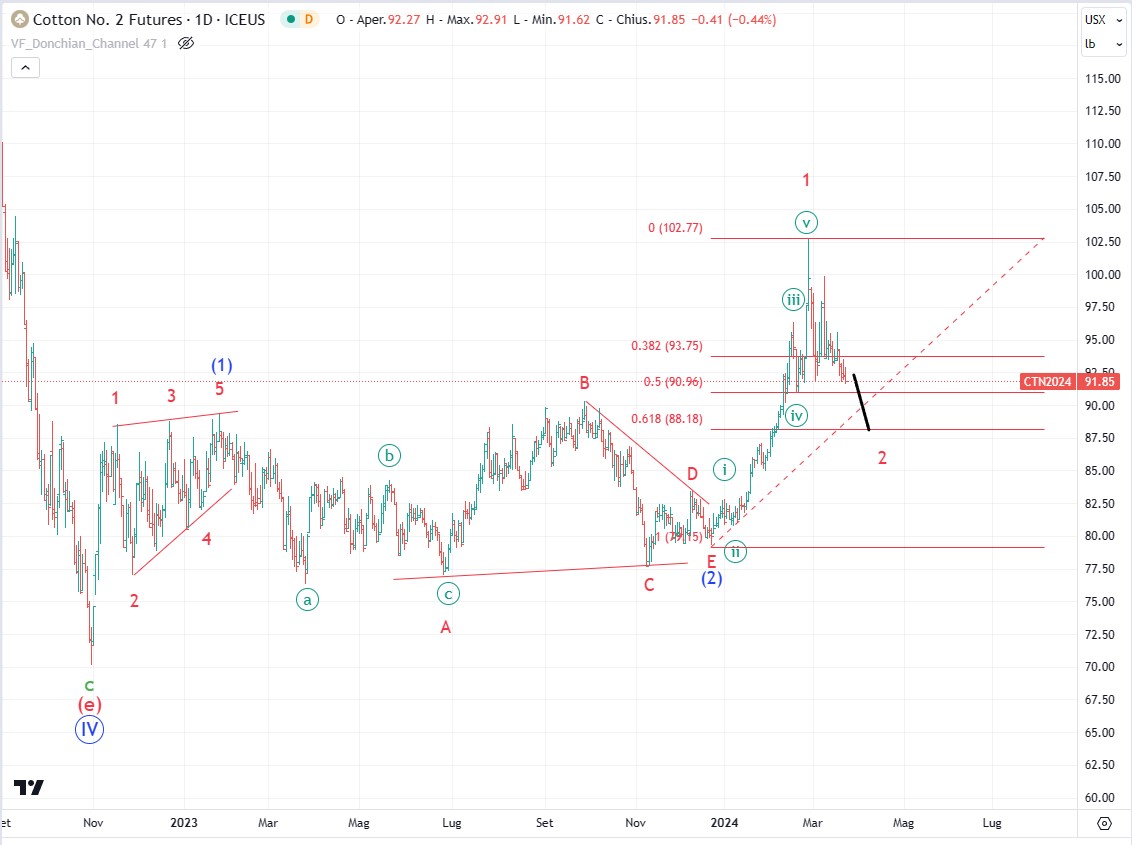 Il cotone a questo punto lo metterei fra gli osservati speciali perché potrebbe essere il prossimo treno (stavolta da non perdere). Se si assume la fine di onda [IV] di Gran super ciclo sul minimo di Ottobre 2022, quello che viene dopo a occhi assomiglia molto ad un 1-2 e inizio di onda 3. Devo dire che etichettare su scala giornaliera quell’1-2 non è stato semplice, ma quello che vedete su scala giornaliera ci stà senza violare nessuna regola.