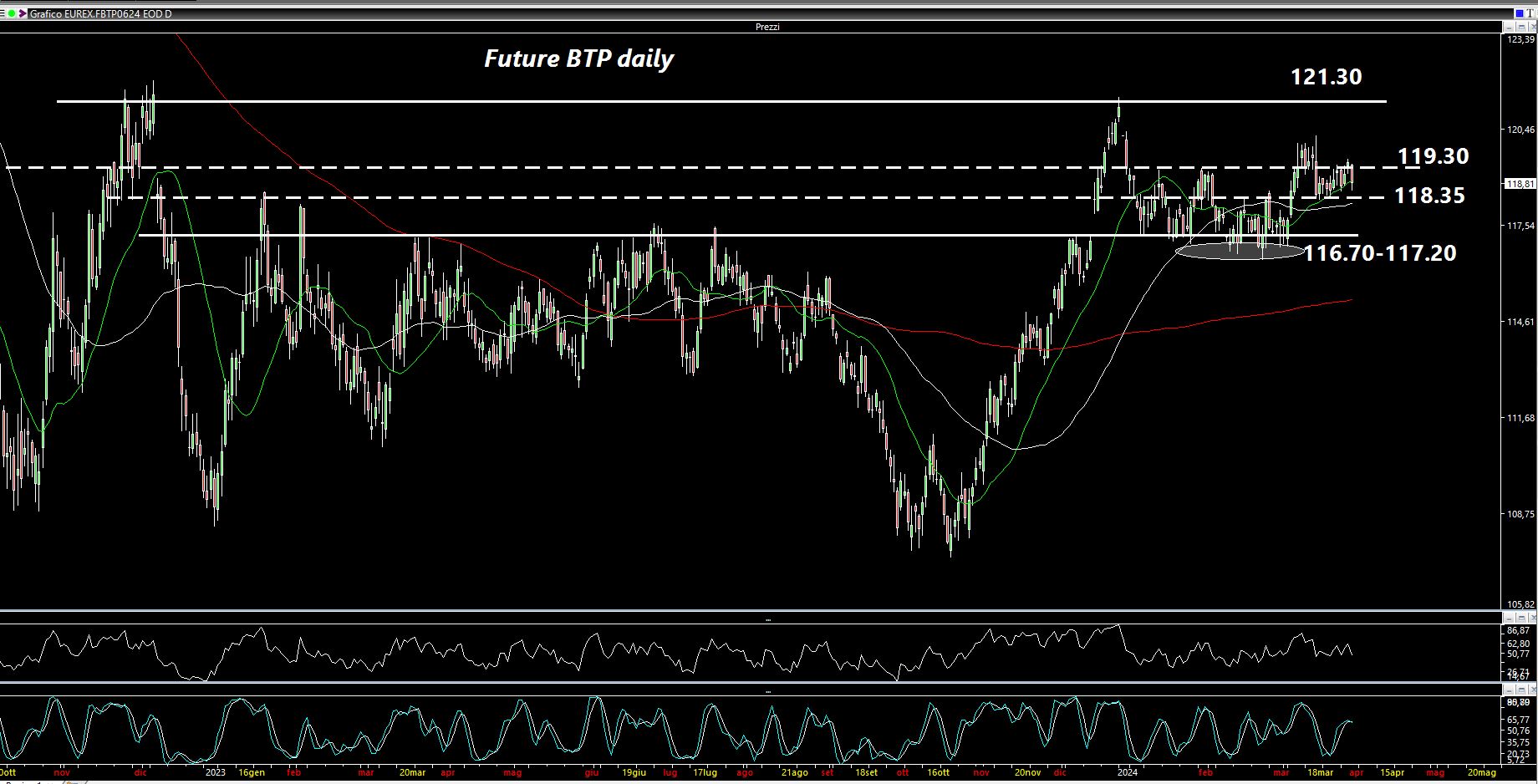 Uno sguardo anche al BTP Future che si trova su aree interessanti e procede formando rettangoli ben delineati: 119.30-118.35 è il box attuale. Sotto abbiamo l'area 116.70-117.20 come supporto importante e sopra l'estensione massima è attorno a 121.30.