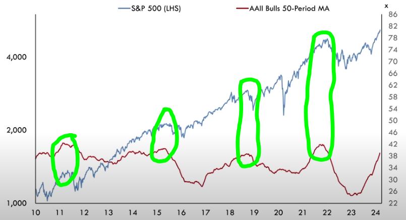 Il passato ci ricorda che quando tutti sono sbilanciati si è vicini ad un -potenziale- picco (sia al rialzo che al ribasso). I livelli attuali che vedete sulla linea rossa nel grafico successivo sono simili all'inizio del picco del 2021 quando il mercato è ancora salito per qualche mese e poi c'è stato il 2022 che credo ricordiate dal momento che tutte le asset class, dall'azionario ai preziosi, dai bonds alle materie prime sono crollati. Questo NON E' un indicatore di timing ma di alert: si può continuare a salire finchè qualcuno continua a comprare.