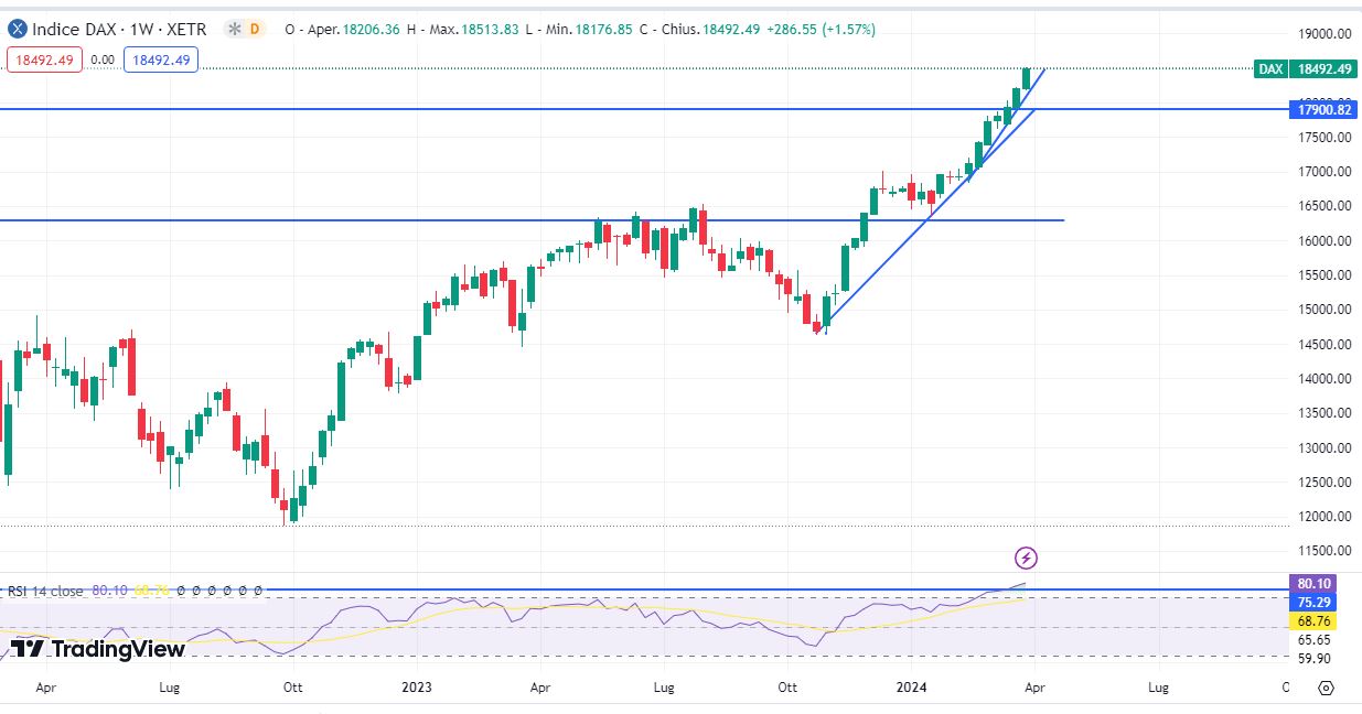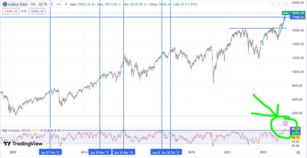 Il Dax30 su scala settimanale ha proseguito nel suo andamento parabolico