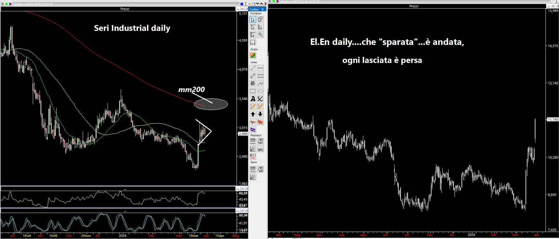 L'ottima ed eccezionale impostazione rialzista -fuori statistica- degli indici di Borsa ha permesso buoni allunghi sulle azioni segnalate la scorsa settimana. Penso ad El.En che purtroppo non ha toccato le aree che avevo in testa (9.88-9.90 euro, ma il minimo settimanale è stato a 10.05) che è riuscita a spingersi a 11.74 euro piuttosto che a Seri Industrial che nonostante la shooting star di venerdì scorso si è stabilizzata attorno a 2.90 euro formando una sorta di triangolo di brevissimo, anch'essa senza lambire i supporti indicati nel mio ultimo report (link articolo: https://www.lombardreport.com/2024/3/23/azioni-el-en-azioni-emak-azioni-banca-ifis/).