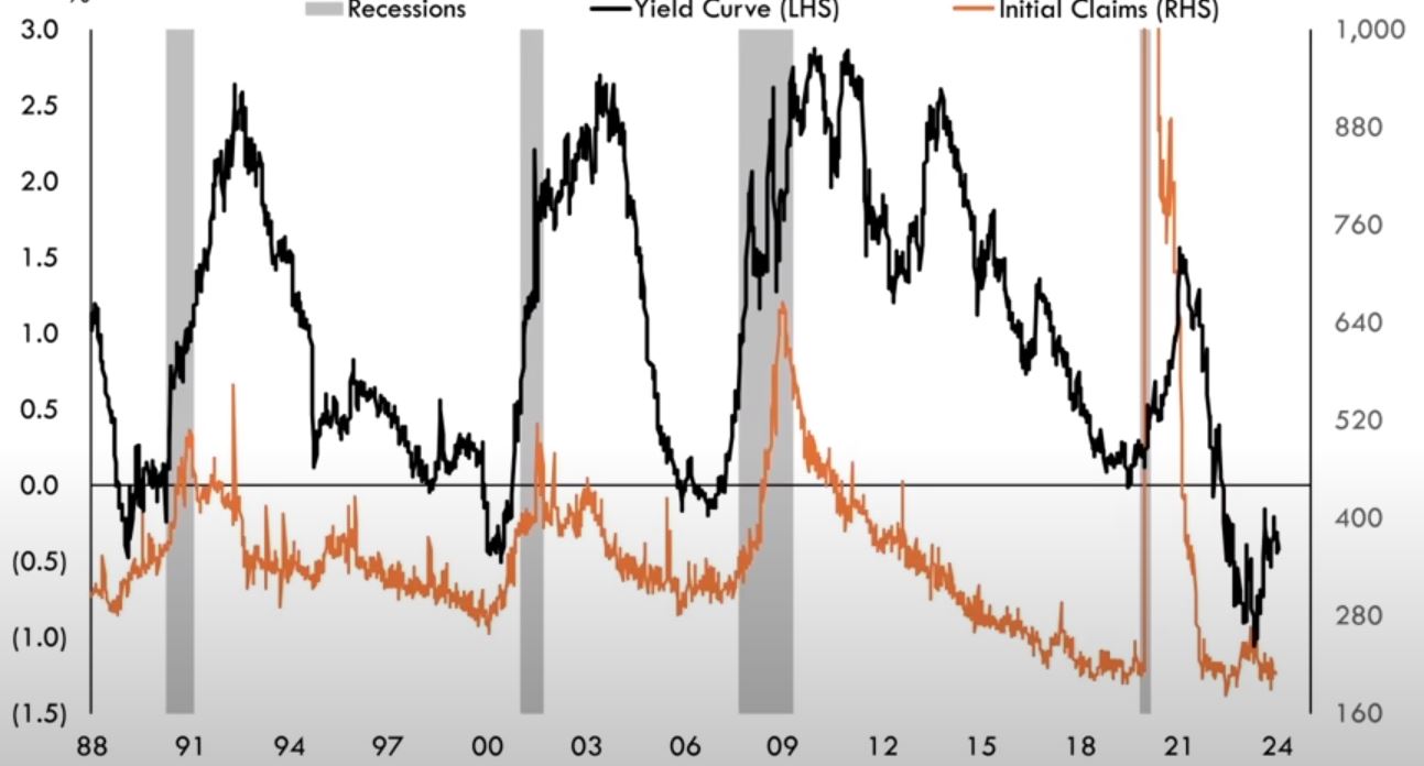 Un'ultima considerazione riguarda il fatto che la curva dei rendimenti (in nero) sta rientrando dall'inversione ed è quindi in risalita. In passato l'inversione della curva ha portato a recessioni ma queste sono sempre state accompagnate da un peggioramento delle condizioni nel mercato del lavoro (curva di colore arancione) che attualmente continua a mostrarsi estremamente resiliente. Nonostante la decisa stretta monetaria dell'ultimo anno, il mercato del lavoro non si è dunque (ancora???) indebolito. Se e quando questo accadrà entreremo in recessione come è successo in passato (istogrammi grigi). In altri termini quando la curva nera, dopo essersi portata al di sotto dello zero, è risalita repentinamente verso lo zero (taglio dei tassi) e contestualmente c'è stato un irripidimento di quella arancione (aumento della disoccupazione) abbiamo avuto una recessione.