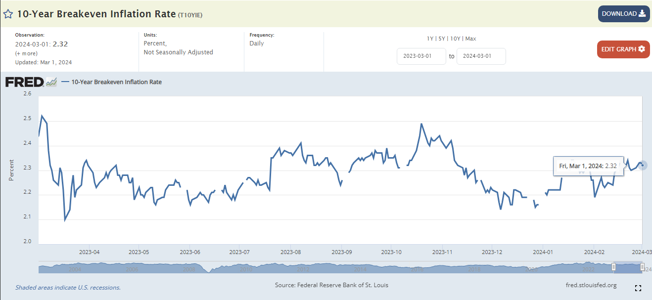 Per completezza di informazione e per fare anche un paragone, riportiamo anche il grafico del breakeven inflation rate decennale, nuovamente al 2,32% dal 2,21% di inizio febbraio (v. grafico FED di S.Louis):