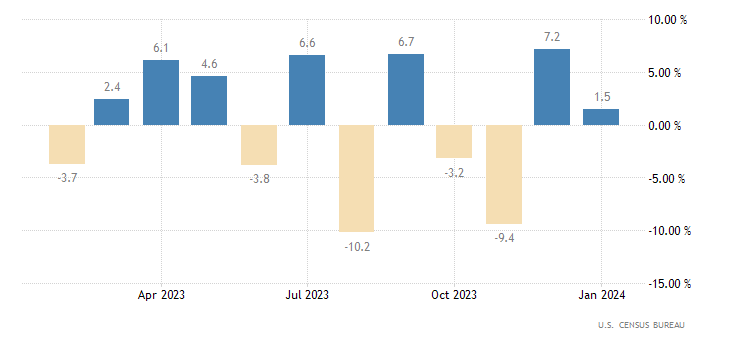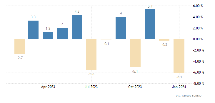 Gli ordini di beni durevoli a livello mensile a gennaio hanno deluso come headline ed ex transportation. Il dato ha registrato un calo del 6,1%, calo più marcato di quello indicato dal consensus, -4,5%. A dicembre era stato registrato un -0,3% (rivisto da +0,0%). Il dato è rilasciato dall’U.S. Census Bureau.