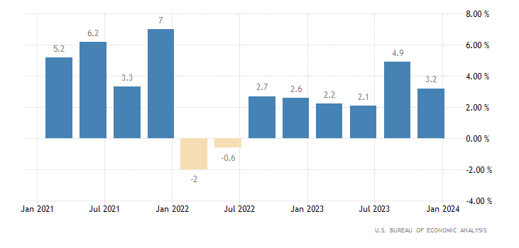 Il secondo dato preliminare del PIL relativo al quarto trimestre 2023 è stato rivisto marginalmente al ribasso, ma in realtà i contributi di consumi, investimenti e residenziale sono tutti stati modificati al rialzo e a causare la revisione al ribasso è stato il livello di scorte, che si riflette positivamente sul trimestre in corso. Il dato segna un +3,2%, appena sotto al primo dato preliminare del +3,3%. Nel terzo trimestre 2023 era stato registrato un +4,9%. Il dato è rilasciato dall’U.S. Bureau of Economic Analysis.