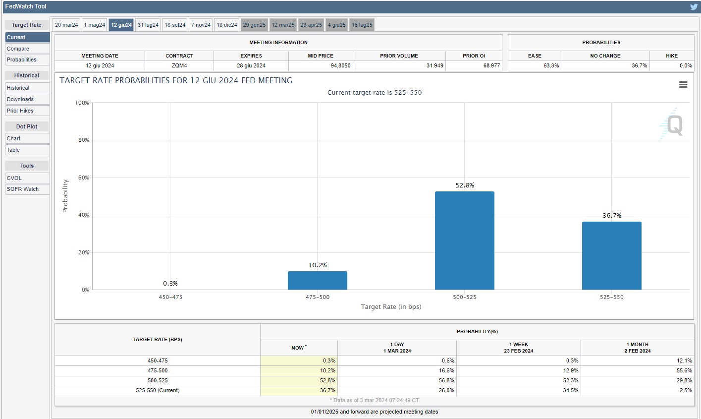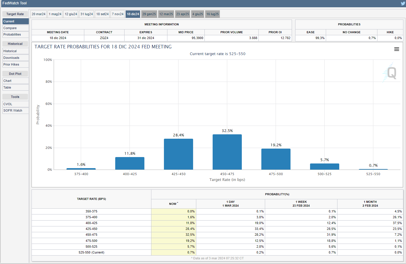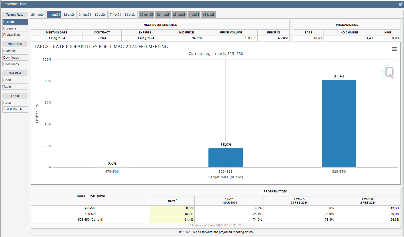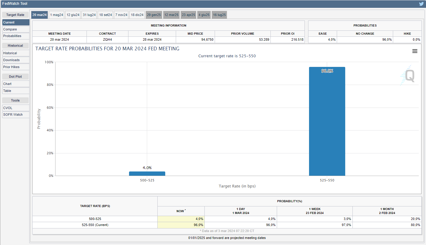 Lo strumento FedWatch del CME Group mostra come i mercati, per la prossima riunione del 2024 in programma il 20 marzo, siano fermi nel prezzare una probabilità del 96,0% di mantenere i tassi fermi come rilevato anche due venerdì fa. Dato praticamente certo visti gli ultimi dati macro e le dichiarazioni dei membri della FED (v. grafico):