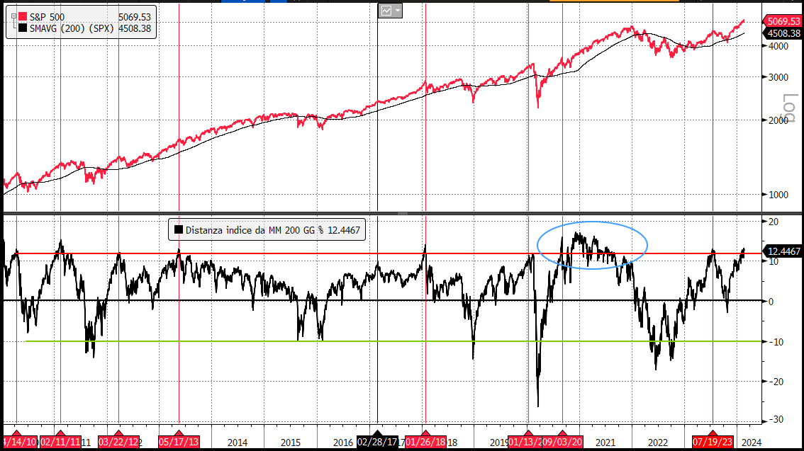 Così siamo arrivati all'appuntamento con il mese di marzo su livelli di ipercomprato e scarsa ampiezza (breadth) degli indici, più volte evidenziati nelle ultime 2 settimane. Ne riportiamo uno nuovo riferito alla scorsa settimana che non fa altro che sottolineare, una volta di più, la forza del recente movimento dai minimi di fine ottobre. La distanza dalla media mobile a 200 giorni dell'S&P500 è superiore al 12%. Come possiamo notare dal seguente grafico, negli ultimi 15 anni questo livello di distanza dalla media mobile ha coinciso con consolidamenti e correzioni.
