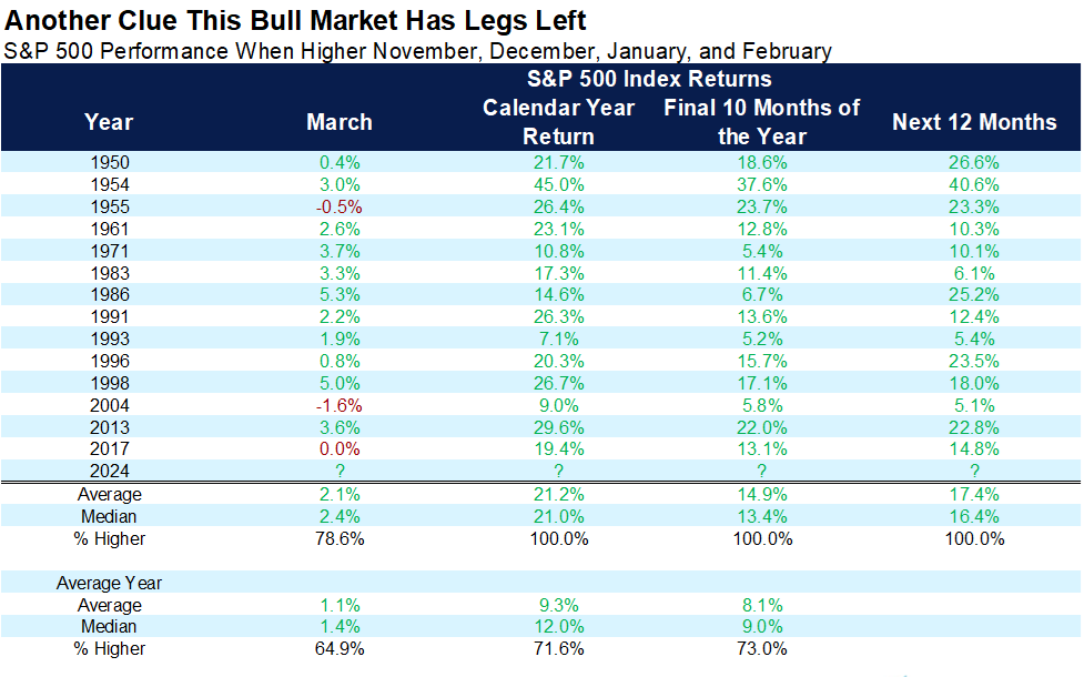 Vi è però un’altra considerazione statistica da fare a proposito. Con la chiusura positiva del mese di Febbraio come quarto mese positivo di seguito, quindi con Novembre, Dicembre, Gennaio e Febbraio tutti positivi, ovvero in 14 occasioni dal 1950, il resto dell'anno ha visto sempre performance positive, senza un esclusione (v. grafico):