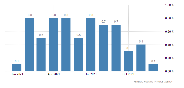 L’indice di prezzo delle case a dicembre si attesta a quota 417,8 punti, realizzando una crescita dello 0,1% rispetto alla rilevazione di novembre di 417,4 punti. Il dato è rilasciato dalla Federal Housing Finance Agency.