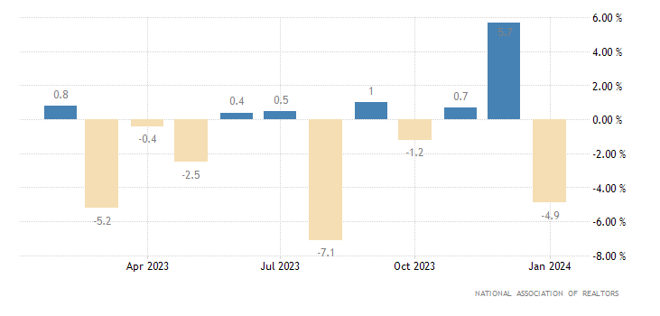 Il dato sulle vendite immobiliari in corso (che misura il cambiamento nel numero di case con contratto di vendita, ma in attesa della transazione di chiusura, escludendo le nuove costruzioni) a gennaio si attesta a quota 74,3 punti, con una contrazione del 4,9% rispetto al dato di dicembre. Il dato è rilasciato dalla National Association of Realtors.