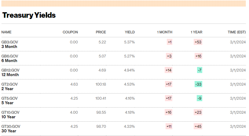 Sul fronte rendimenti bella discesa su tutte e tre le scadenze più importanti grazie soprattutto ai dati macro usciti ed alla consapevolezza degli investitori in bonds che l’inflazione sta scendendo, anche se lentamente, e che per l’inizio dei tagli da parte della FED bisognerà aspettare giugno e che l’ampiezza dei tagli non sarà così ampia come pronosticato qualche mese fa. Pertanto, abbiamo visto scendere più rapidamente il rendimento della scadenza corta che ha chiuso l’ottava al 4,535% dal 4,694% di due venerdì fa, perde meno il Treasury 10Y che dal 4,252% di due venerdì fa passa all’attuale 4,184%, mentre il 30Y dà solo una limatina alla perdita passando dal 4,371% di due venerdì fa, all’attuale 4,329%.
