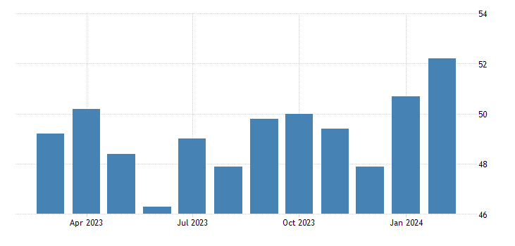 Il dato di febbraio del PMI manifatturiero S&P Global è pari a 52,2 punti, sopra il dato preliminare di 51,5 punti ed in rialzo rispetto ai 50,7 punti registrati a gennaio.