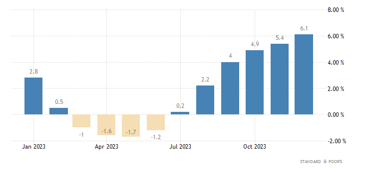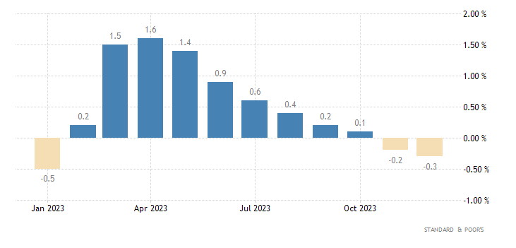 L’S&P/Case-Shiller Home Price Index, che valuta le variazioni nel valore del mercato immobiliare residenziale in 20 regioni degli USA ha preso a rallentare di nuovo. A livello mensile a dicembre segna un -0,3%, calo appena più marcato del -0,2% di novembre.