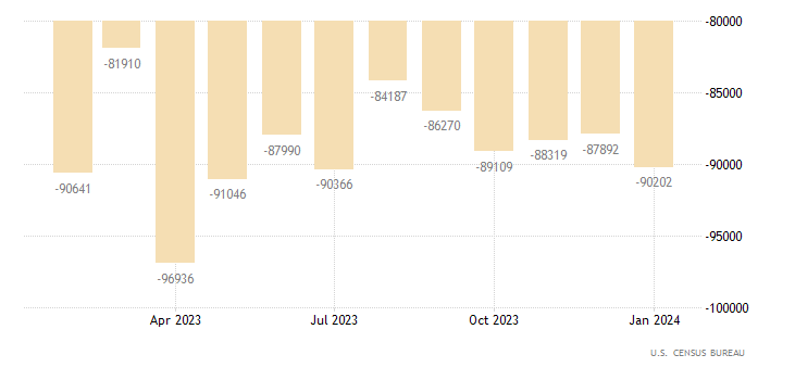 Il dato preliminare di gennaio della bilancia commerciale di beni si attesta a -90,2 miliardi di dollari, dopo il dato di dicembre di -87,89 miliardi di dollari (rivisto da -88,46 miliardi di dollari). Il dato è rilasciato dall’U.S. Bureau of Economic Analysis.