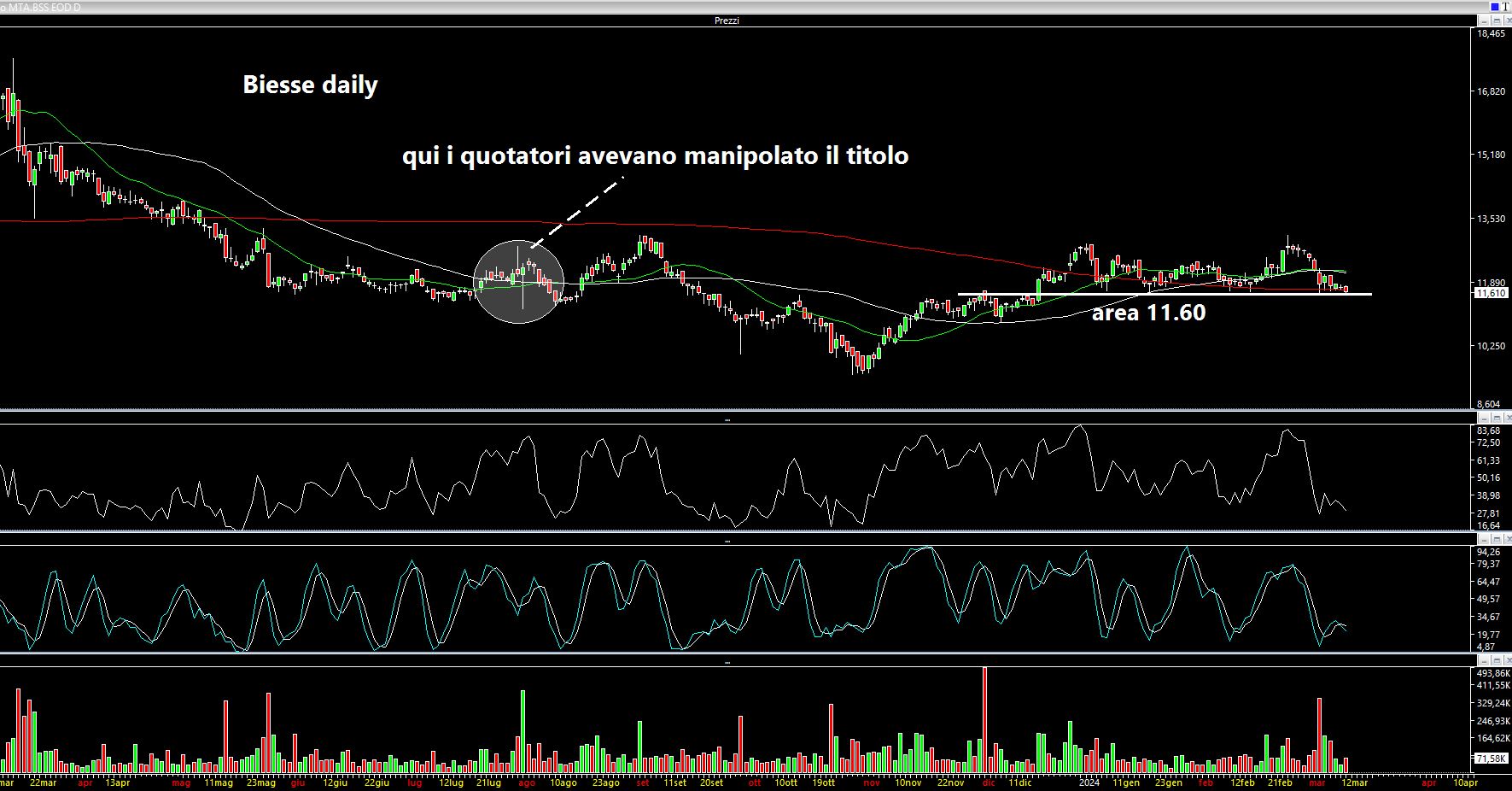 Sul daily il titolo si sta imbruttendo: pare voglia abbandonare la media mobile a 200 periodi con la quale sta "flirtando" pericolosamente. Ricordo che in un mio vecchio articolo di luglio dello scorso anno avevo messo in evidenza con tanto di immagini come i software quotatori avessero "manovrato ad arte" il titolo. Biesse deve riportare il 14 marzo e non mi stupirebbe di vedere movimenti anomali: quale migliore occasione?