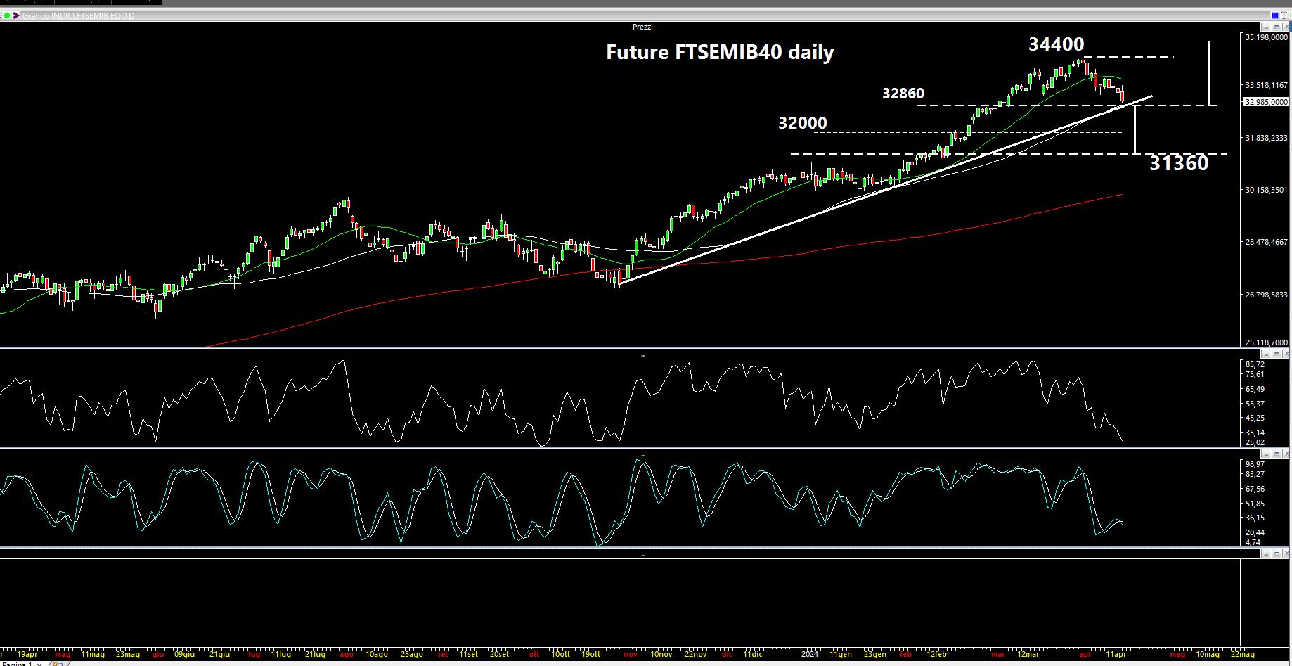 Il test e l'eventuale rottura di 32860 che coinciderebbe con la rottura della trendline dinamica menzionata vedrebbe un primo supporto successivo a 32000 prima e poi in area 31360 da dove è partita l'ultima gamba rialzista. Tale obiettivo lo si ottiene calcolando la differenza tra il punto di massimo (area 34400) e 32860: 1540 punti. Se venisse bucata la trendline la proiezione verso il basso dal punto di rottura vedrebbe appunto 31360. Come sempre preferisco non ragionare da geometra o da ingegnere ma da trader. Potrebbe anche crearsi un box, ma per questa ipotesi ci dovremmo riportare sopra i 33500-33600 ma al momento il mercato ha chiuso la settimana a 32985 punti.