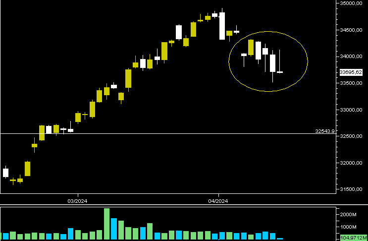 Nel primo giorno di contrattazione seguente le festività pasquali, qualche operatore aveva provato a forzare la mano, a testare la resistenza degli aquirenti, i volumi erano improvvisamente cresciuti anche se poi un lento recupero aveva fatto riguadagnare le zone alte, ma poi di nuovo colpi di vendite importanti, sino a giungere all'ottava terminata da poco, la prima dopo un lunghissimo periodo, che si chiude in negativo.