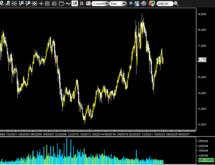 Questo grafico ha bisogno di essere depurato del picco relativo al 2000 ma tuttavia ha un target di trading range ai 3€ circa ed al momento ha zone di intervento e di ingresso ai 1.33€.