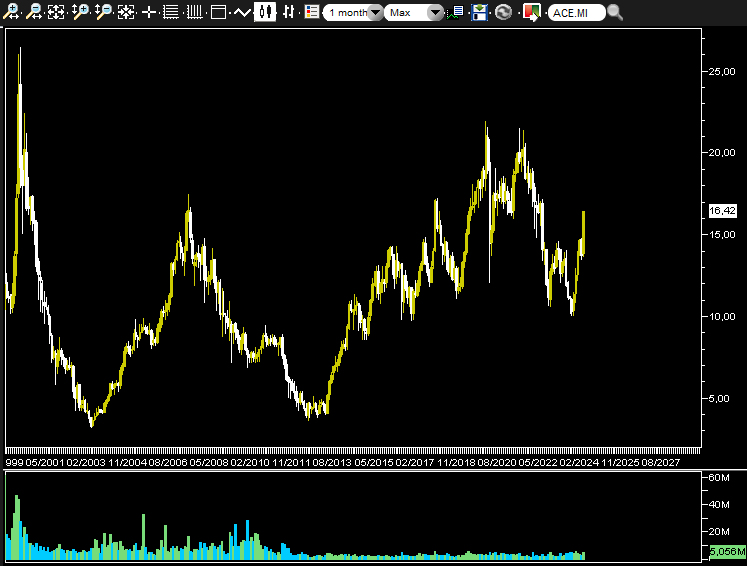 Per Acea , visto il grafico a timeframe mensile essendo società adatte ad investitori cassettisti, ha un livello switch ai 15€ e un ulteriore livello di attività ai 13€. Il target non può che essere ai precedenti massimi ovvero ai 23€