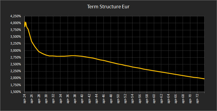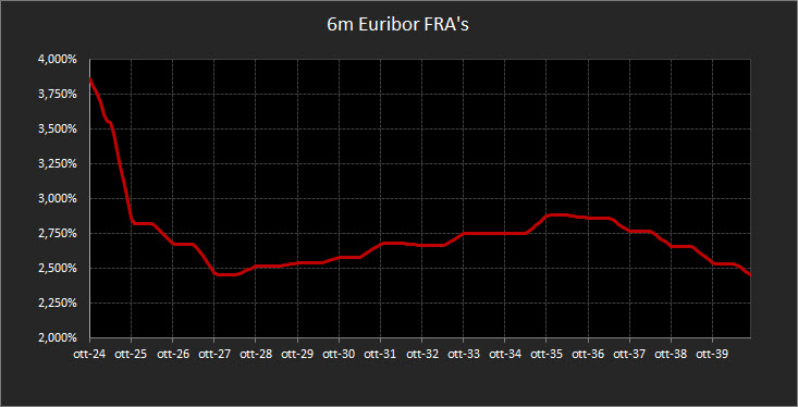 Di fatto stabili le previsioni dei tassi forward su Euribor 6 mesi sulle scadenze a breve, con tassi attesi sempre poco sotto area 4,00% per la seconda metà del 2024, mentre cambia la situazione sulla dinamica dell’atteso taglio dei tassi. Infatti, ora la curva scendere sì sempre repentinamente ma si ferma in area 2,50% solo verso fine 2027 invece che verso fine 2025 rispetto alla precedente analisi. La risalita dei tassi è per ora vista sempre ad inizio 2028, data dalla quale sono visti in progressione ora ben sopra area 2,75% nel tratto a lunga.