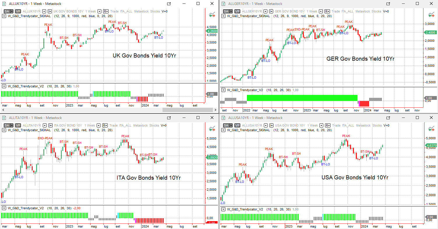 Analizzando con il Trendycator le curve dei rendimenti su scala settimanale dei principali benchmark decennali si nota sempre la persistenza prevalente di una fase laterale che preme però sul bordo superiore, salvo che sull’area USA, che sembra voler proiettare i rendimenti verso i massimi di fine 2023.