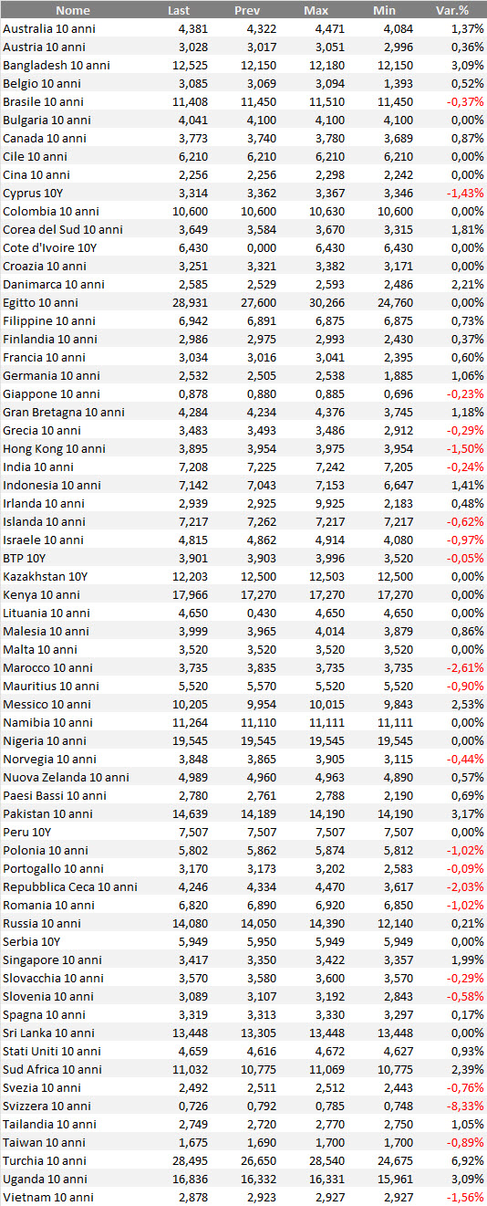 Consueta sezione dell’analisi sui mercati obbligazionari, con l’introduzione sotto forma di ranking dei bond governativi mondiali con qualunque rating. In alcuni casi, per alcuni emittenti o per alcune valute, il rapporto rischio/rendimento di questi bond può essere anche piuttosto speculativo. Il ranking considera i bond benchmark decennali in tutte le valute di emissione.
