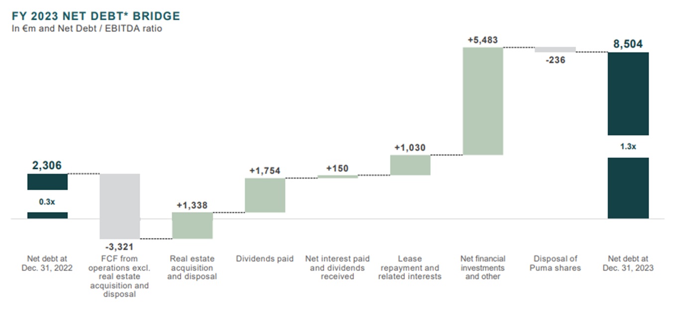 Qui di seguito si nota la dinamica della PFN nel corso del 2023: il peggioramento lo si spiega prevalentemente con gli investimenti che hanno assorbito ben € 5,483 mld + € 1,338 mld.