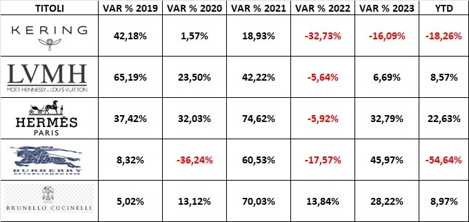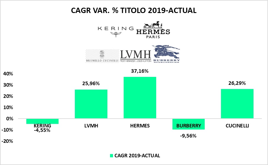 Dal 2019, il CAGR di crescita del titolo KERING è stato pari al -4,55%: tale dato è in netta contrapposizione con quanto evidenziato dagli altri titoli (BURBERRY escluso).