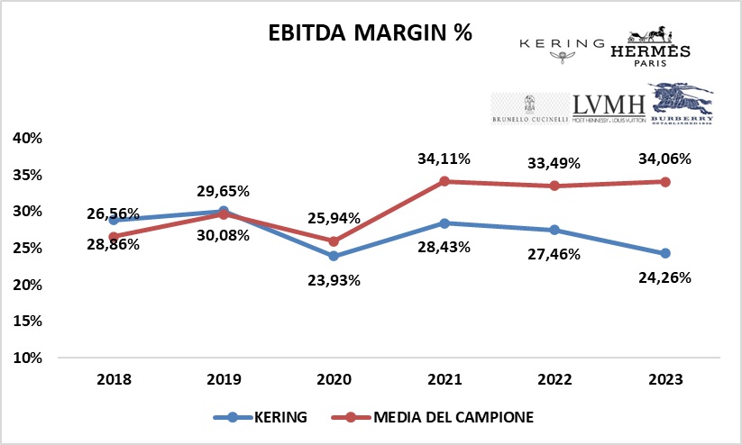 Dal punto di vista dell'EBITDA MARGIN %, fino al 2020, l'andamento di KERING era pressochè assimilabile alla media del campione. A partire dal 2021 la forbice si è particolarmente allargata.