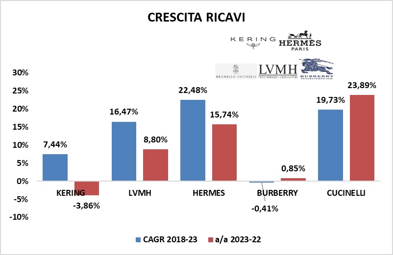 La contrazione dei ricavi di KERING nel corso del 2023 (-3,86%) non è stata riportata da nessun altra comparables.