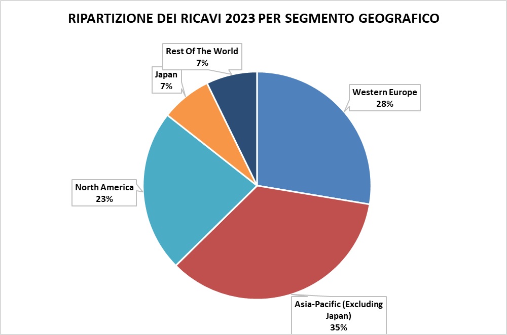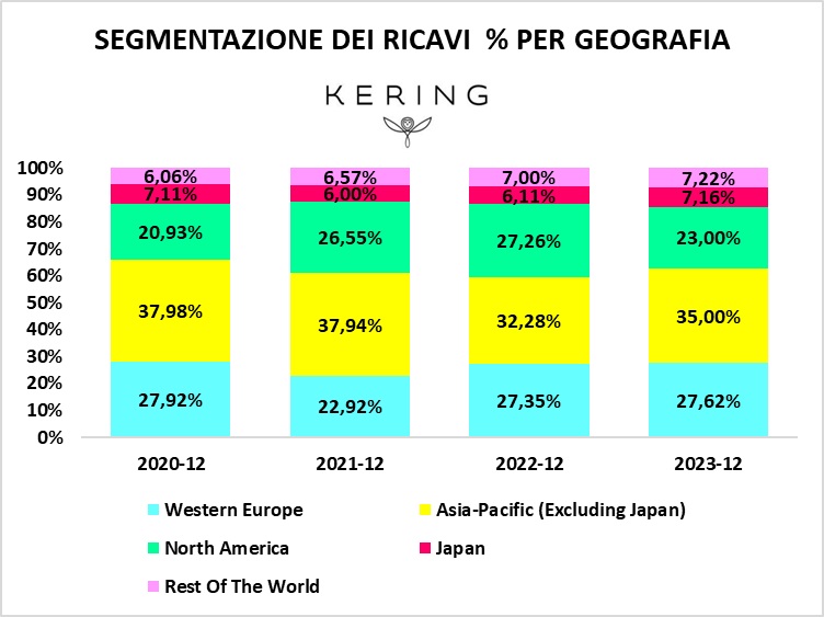 Dal punto di vista della ripartizione geografica del fatturato, i ricavi di KERING si dimostrano ben diversificati. Le zone più prolifiche sono l'Asia (42%), l'Europa (28%) ed il Nord America (23%).
