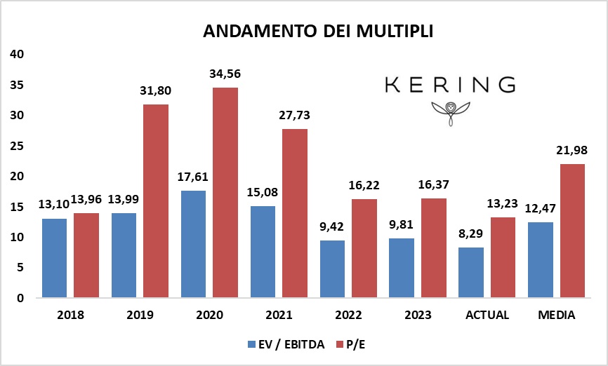 In termini assoluti, da quanto emerge con il confronto con i competitor, KERING risulta avere legittimamente un profilo di multipli più contenuti. Approfondendo però lo studio si nota che i livelli attuali risultano essere piuttosto distanti dalle loro medie storiche.