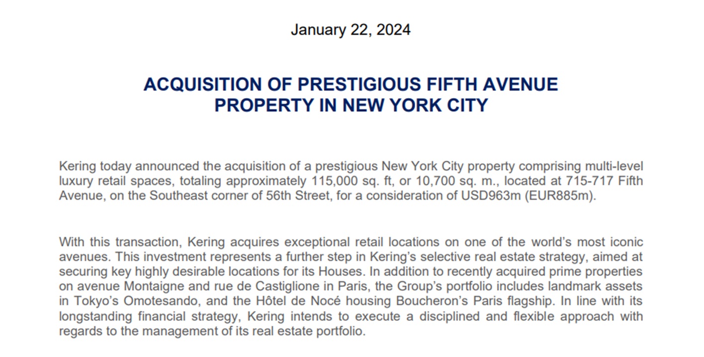 - gennaio 2024: acquisto di una prestigiosa proprietà nella FIFTH AVENUE di New York;