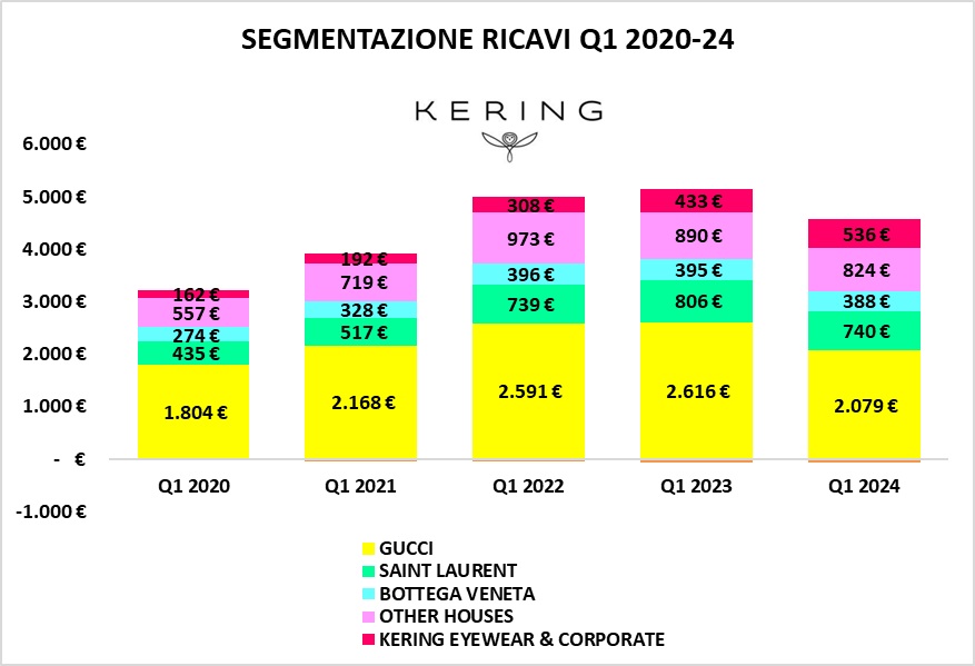 Lo scenario complicato del 2023 si è protratto anche nei primi mesi del 2024: secondo quanto emerge dalla nota recentemente pubblicata da KERING, i ricavi sono in flessione dell'11,23%. Al principale brand, GUCCI, le cose sono andate addirittura peggio, da € 2,616 mld si è passato agli attuali € 2,079 mld, ovvero il -20,5%.
