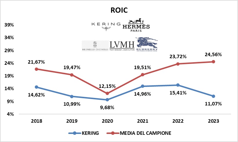 Prendendo come riferimento il ROIC si nota che il profilo di KERING sia sempre stato ben inferiore alla media del campione.