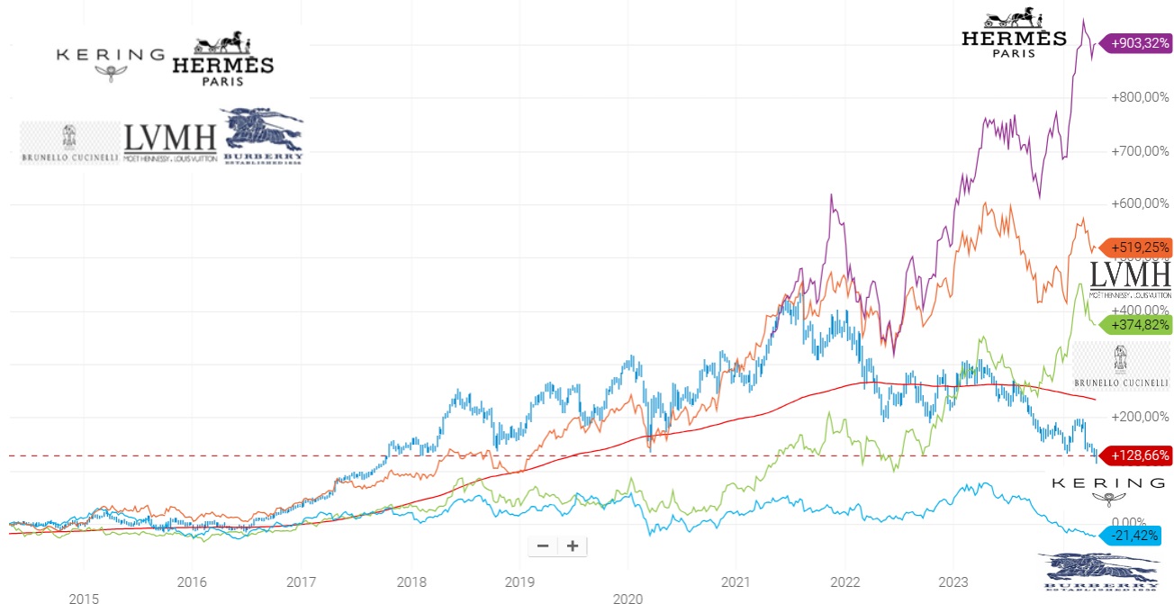 Allargando lo spettro temporale dell'analisi, considerando gli ultimi 10 anni, nel grafico che segue si nota che KERING ha registrato un +126,66% a fronte di risultati ben superiori degli altri titoli (BURBERRY escluso).