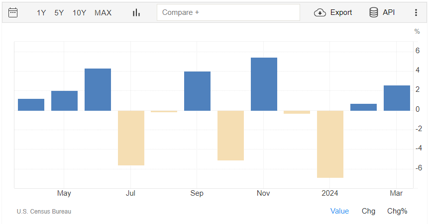 Gli ordini di beni durevoli a livello mensile a marzo crescono del 2,6%, quasi esattamente in linea con il consensus del +2,5% e dopo il +0,7% di febbraio (rivisto da +1,3%). Il dato è rilasciato dall’U.S. Census Bureau.
