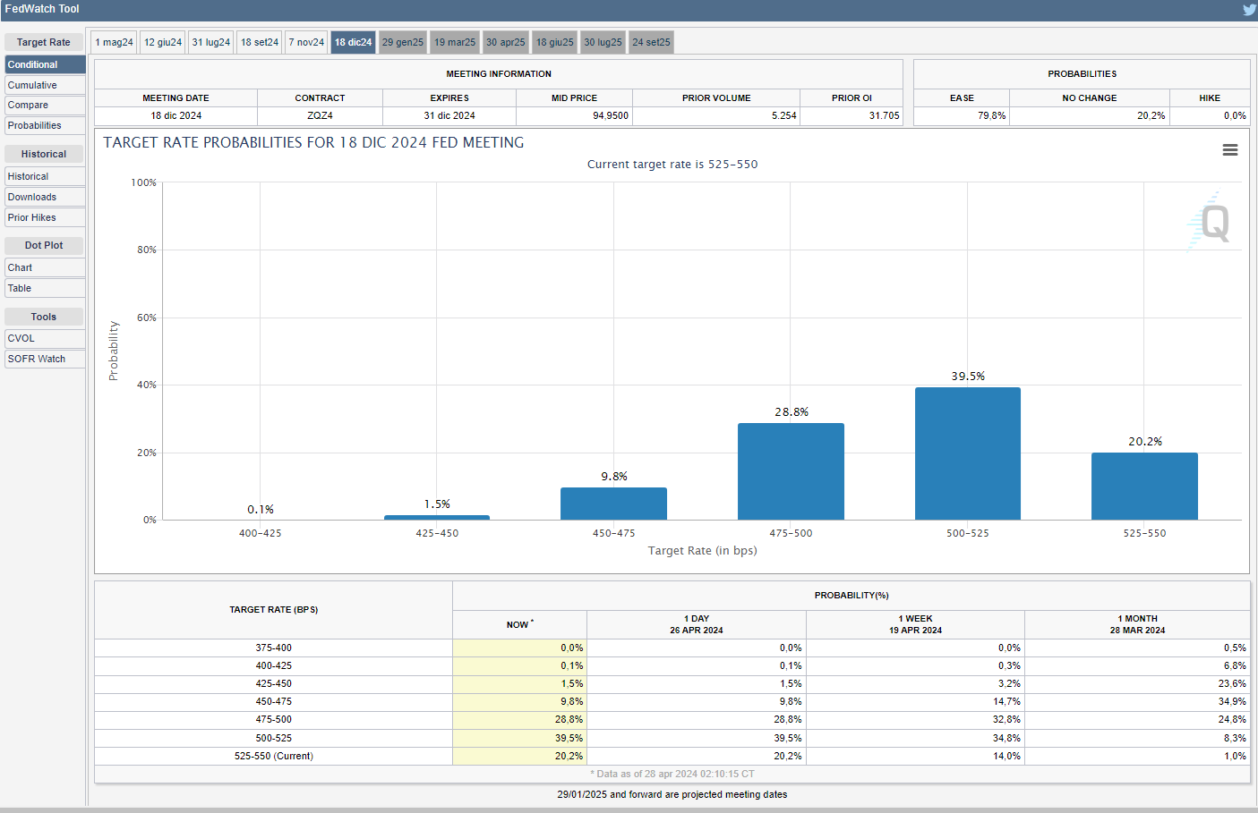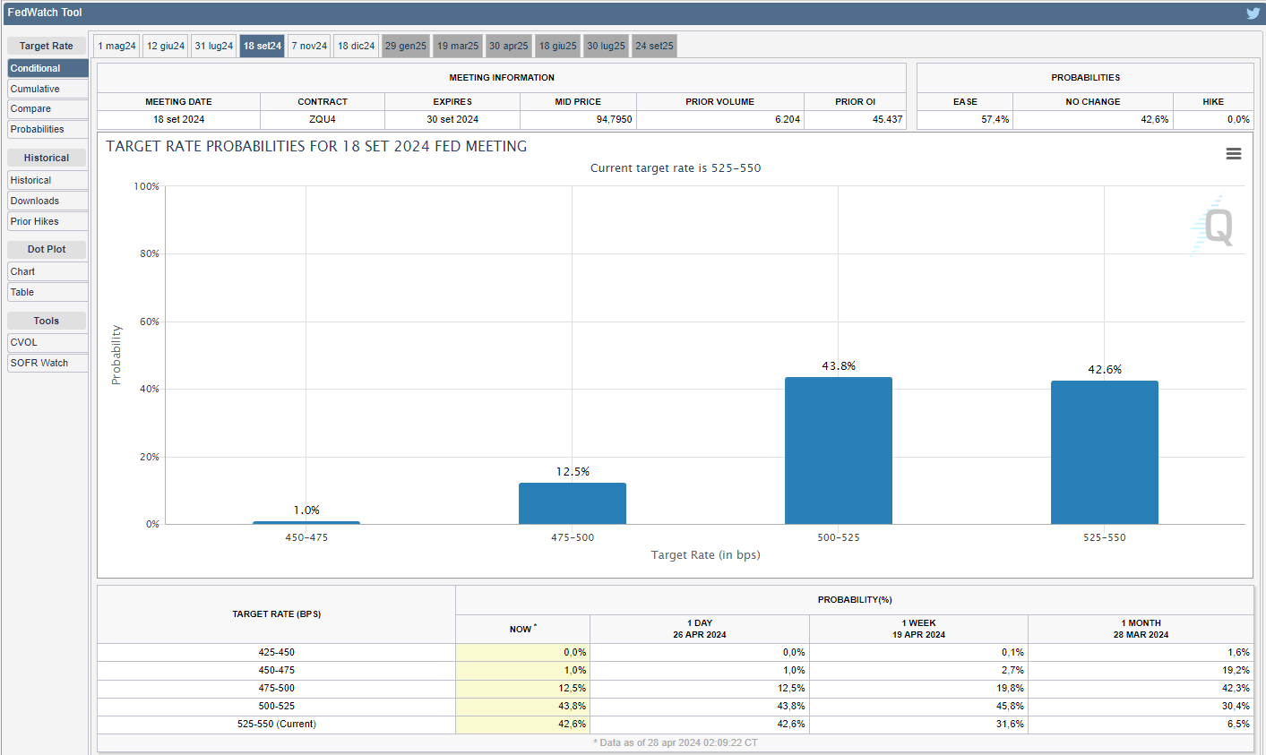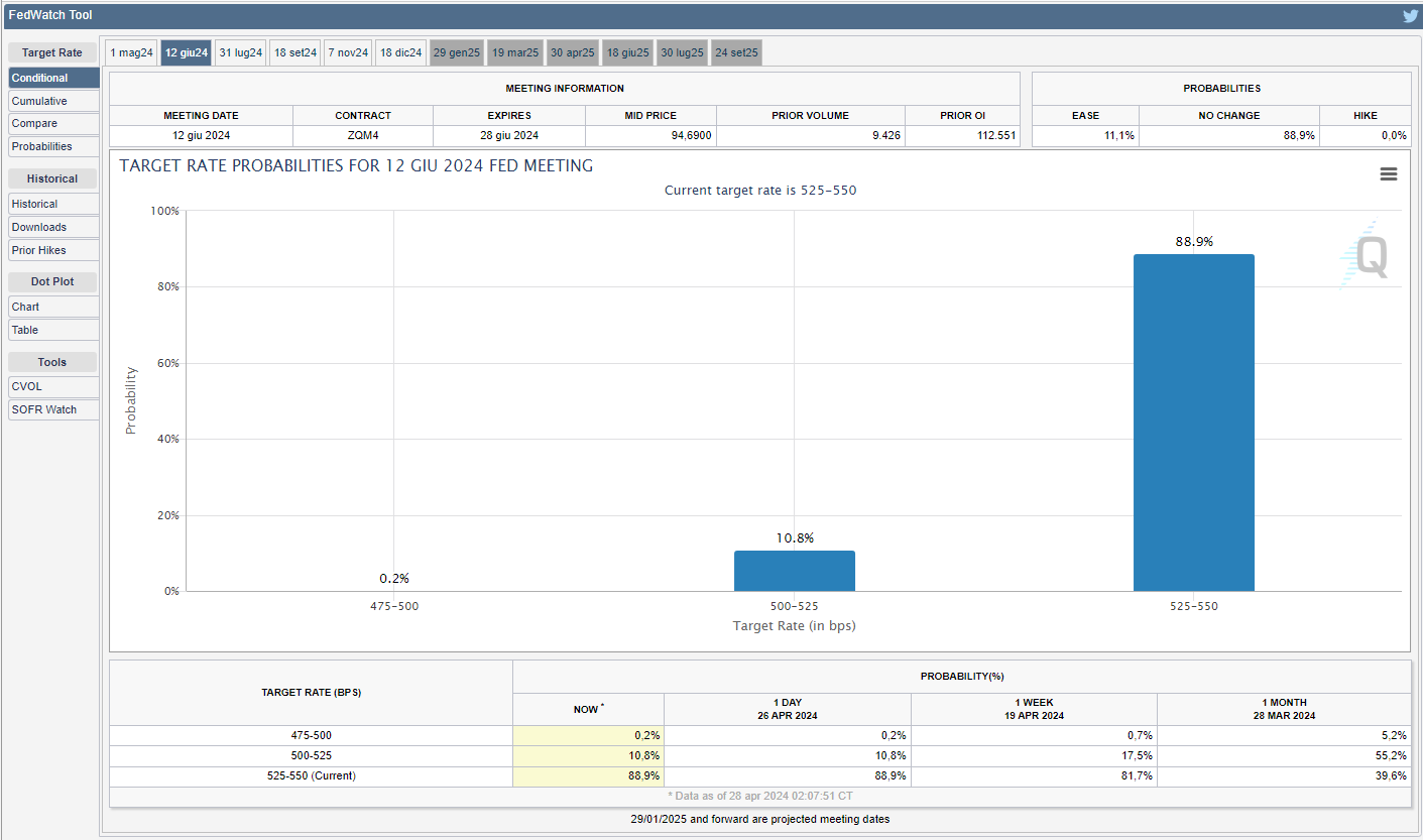 Tralasciando la prossima riunione in programma mercoledì, nella quale le probabilità di un taglio dei tassi è praticamente nullo, lo strumento FedWatch del CME Group mostra come i mercati, per la successiva riunione del 2024 in programma il 12 giugno, prezzino una probabilità dell’88,9% di mantenere i tassi fermi in rialzo in aumento rispetto all’83,0% di due venerdì fa e, addirittura, del 39,6% di un mese fa (v. grafico):