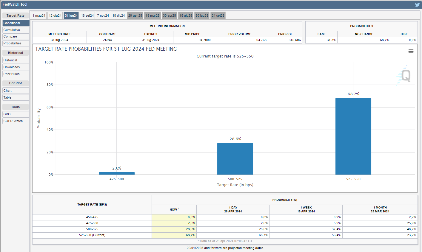 Cambiato definitivamente anche il mese ‘clou’ per quanto riguardano le probabilità del primo taglio dei tassi che, da quello relativo alla riunione del 31 luglio, passa a quella del 18 settembre, in quanto le probabilità di un taglio di 25 bps si abbassano ulteriormente al 28,6 % rispetto al 37,1% di due venerdì fa. Mentre si alzano notevolmente le probabilità per nessun taglio al 68,7% rispetto al 57,3% di due venerdì fa (v. grafico):