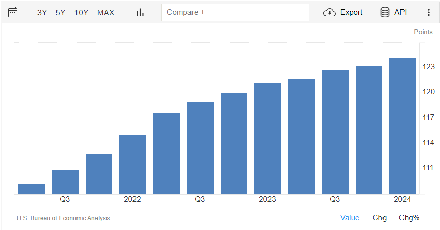 Il dato preliminare del primo trimestre relativo all’indice dei prezzi PIL, invece, segna un +3,1%, appena sopra al consensus del +3,0% ed in crescita rispetto al +1,7% dell’ultimo trimestre 2024. Il dato è rilasciato dall’U.S. Bureau of Economic Analysis.