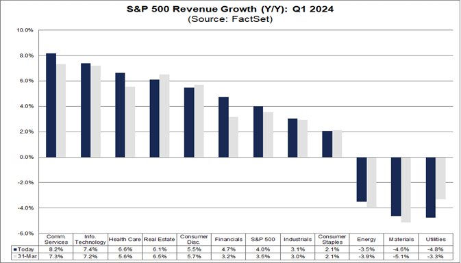 In termini di ricavi, il 60% delle società S&P500 ha riportato ricavi effettivi superiori alle stime, Nel complesso, le aziende segnalano ricavi superiori dell'1,3% alle stime, mentre il tasso di crescita misto dei ricavi (che combina i risultati effettivi per le aziende che hanno segnalato e i risultati stimati per le aziende che devono ancora presentare report) per il primo trimestre è oggi del 4,0%. In questo caso si tratterà del 14° trimestre consecutivo di crescita dei ricavi per l'indice. Otto settori stanno segnalando una crescita dei ricavi anno su anno, guidati dai settori dei servizi di comunicazione e della tecnologia dell’informazione. D’altro canto, tre settori stanno segnalando un calo dei ricavi anno su anno, guidati dai settori Utilità e Materiali.